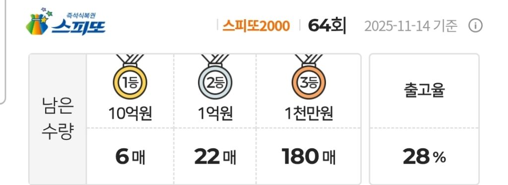 스피또2000 즉석복권 64 남은수량 1등 6매(총 8매 중), 2등 22매(총 24매 중), 3등 180매(총 200매 중)가 남아있습니다. 출고율(판매점 입고율)은 28%입니다.
