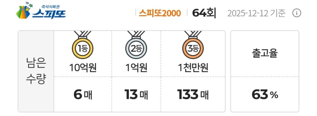 스피또2000 즉석복권 64회 남은수량 1등 6매(총 8매 중), 2등 13매(총 24매 중), 3등 133매(총 200매 중)가 남아있습니다. 출고율(판매점 입고율)은 63%입니다.