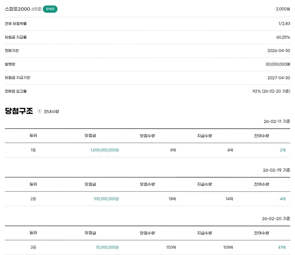 65회 스피또2000 1등 남은 수량 및 출고율 정보 및 당첨현황 정보입니다