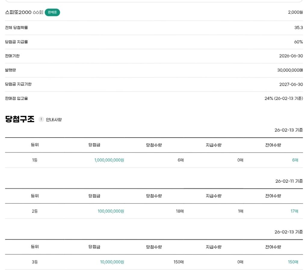 스피또2000 즉석복권 66회 출고율(판매점 입고율)은 24%입니다. 남은 수량은 아래 당첨구조를 참고하세요.
