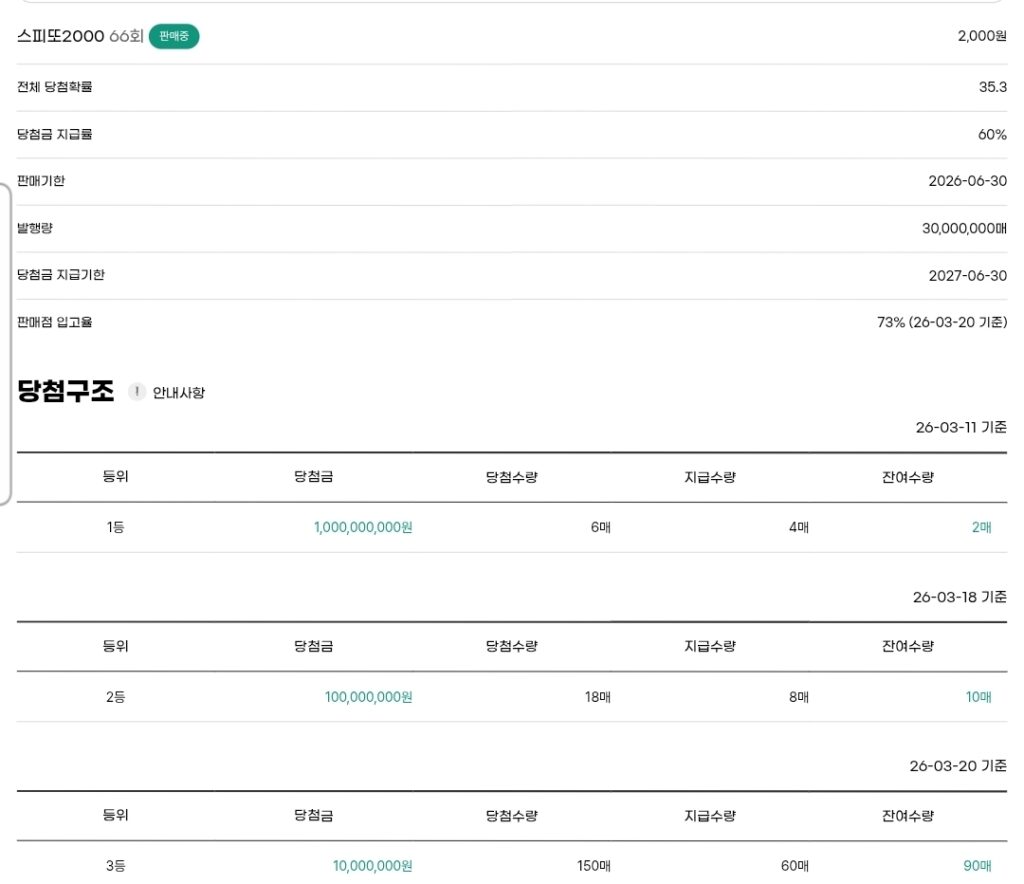 스피또2000 즉석복권 66회 출고율(판매점 입고율)은 73%입니다. 남은 수량은 아래 당첨구조를 참고하세요.