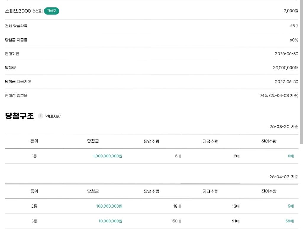 스피또2000 즉석복권 66 출고율(판매점 입고율)은 74%입니다. 남은 수량은 아래 당첨구조를 참고하세요.