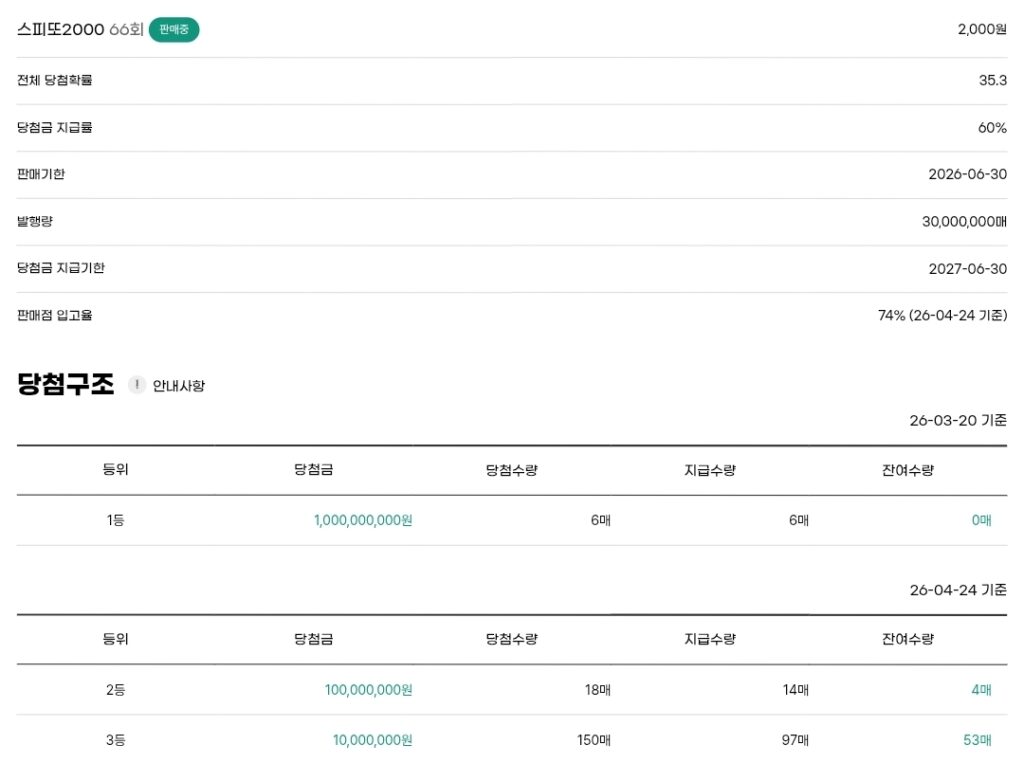 스피또2000 즉석복권 66 출고율(판매점 입고율)은 74%입니다. 남은 수량은 아래 당첨구조를 참고하세요.