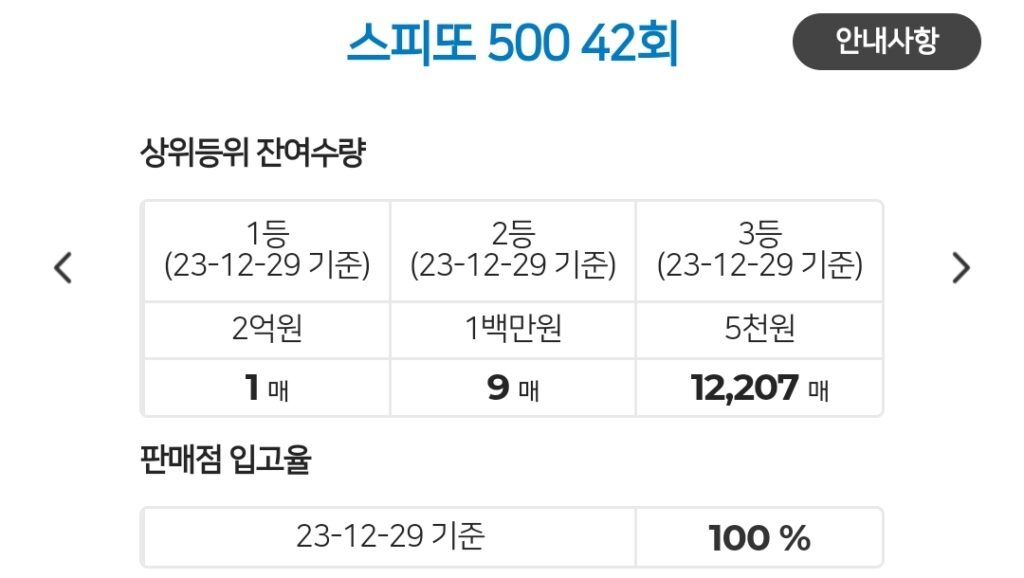 스피또500 42회 출고율(판매점 입고율) / 스피또500 42회 당첨현황(2023.12.29 기준)