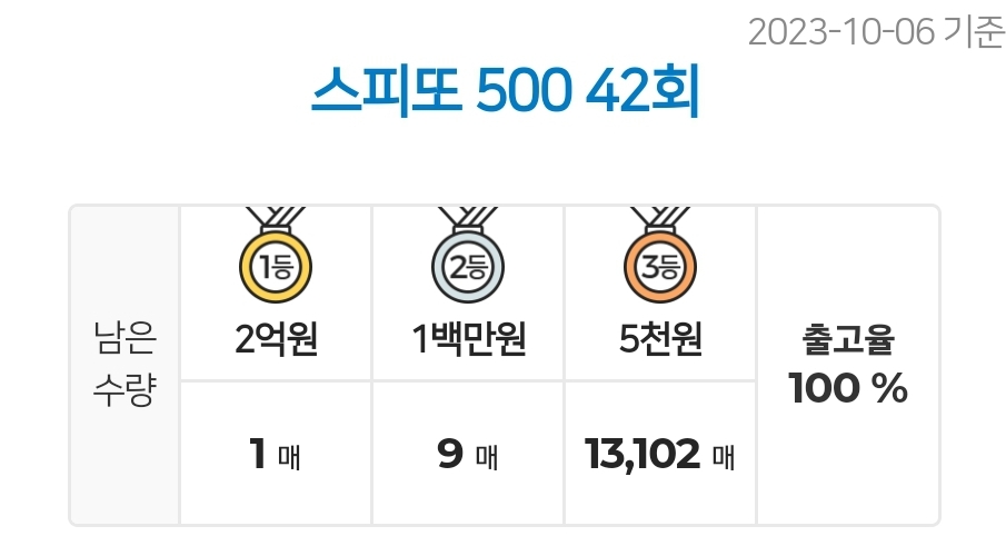 - 스피또500 42회 출고율 / 스피또500 42회 당첨현황(2023.10.06 기준)