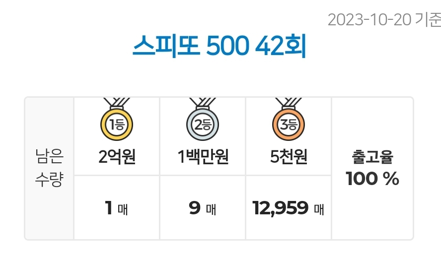 - 스피또500 42회 출고율 / 스피또500 42회 당첨현황(2023.10.20 기준)