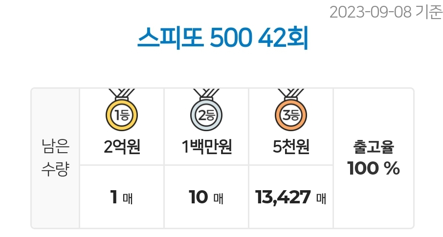 - 스피또500 42회 1등 남은 수량 및 출고율 (2023.09.08 기준)