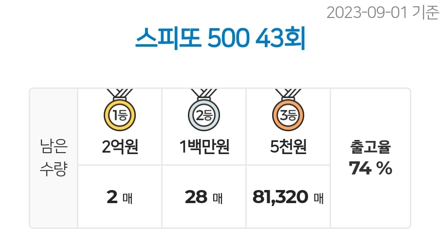 스피또500 복권 43회 남은수량 1등 2매(총 3매 중), 2등 28매(총 60매 중), 3등 81,320매(총 180,000매 중)가 남아 있습니다. 출고율은 74%입니다. 출고율의 의미와 당첨확률을 높이는 방법은 스피또 당첨확율을 높이는 방법은? 구입전에 출고율과 남은 수량을 확인은 필수! 포스팅을 참고하세요.