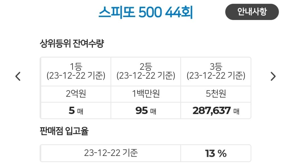 스피또500 44회 출고율(판매점 입고율) / 스피또500 44회 당첨현황(2023.12.22기준)