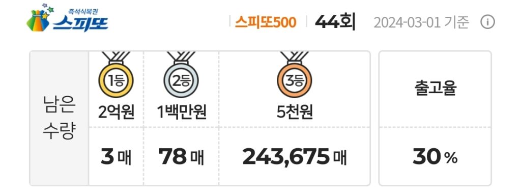 스피또500 복권 44회 남은수량 1등 3매(총 4매 중), 2등 78매(총 100매 중), 3등 243,675매(총 300,000매 중)가 남아 있습니다. 출고율(판매점 입고율)은 30%입니다. 출고율의 의미와 당첨확률을 높이는 방법은 스피또 당첨확율을 높이는 방법은? 구입전에 출고율과 남은 수량을 확인은 필수! 포스팅을 참고하세요.