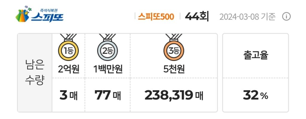 스피또500 44회 1등 남은 수량 및 출고율 정보 및 당첨현황 정보입니다.