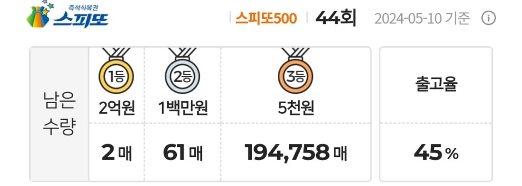 스피또500 44회 1등 남은 수량 및 출고율 정보 및 당첨현황 정보입니다.