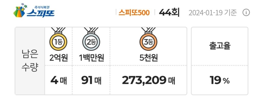 스피또500 복권 44회 남은수량 1등 4매(총 5매 중), 2등 91매(총 100매 중), 3등 273,209매(총 300,000매 중)가 남아 있습니다. 출고율(판매점 입고율)은 19%입니다. 출고율의 의미와 당첨확률을 높이는 방법은 스피또 당첨확율을 높이는 방법은? 구입전에 출고율과 남은 수량을 확인은 필수! 포스팅을 참고하세요.