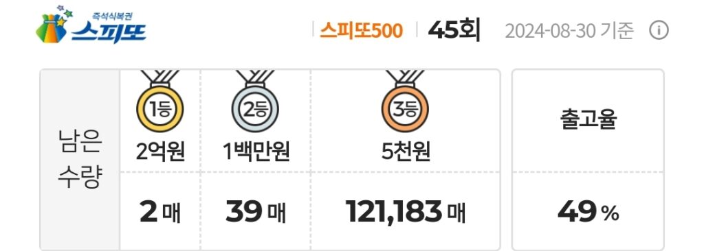 스피또500 복권 45회 남은수량 1등 2매(총 3매 중), 2등 39매(총 60매 중), 3등 121,183매(총 180,000매 중)가 남아 있습니다. 출고율(판매점 입고율)은 49%입니다. 출고율의 의미와 당첨확률을 높이는 방법은 스피또 당첨확율을 높이는 방법은? 구입전에 출고율과 남은 수량을 확인은 필수! 포스팅을 참고하세요.