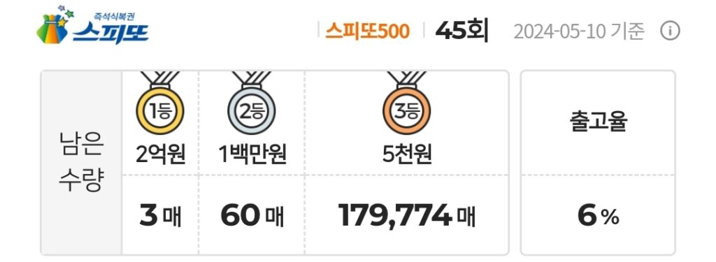 스피또500 복권 45회 남은수량 1등 3매(총 3매 중), 2등 60매(총 60매 중), 3등 179,744매(총 180,000매 중)가 남아 있습니다. 출고율(판매점 입고율)은 6%입니다. 출고율의 의미와 당첨확률을 높이는 방법은 스피또 당첨확율을 높이는 방법은? 구입전에 출고율과 남은 수량을 확인은 필수! 포스팅을 참고하세요.