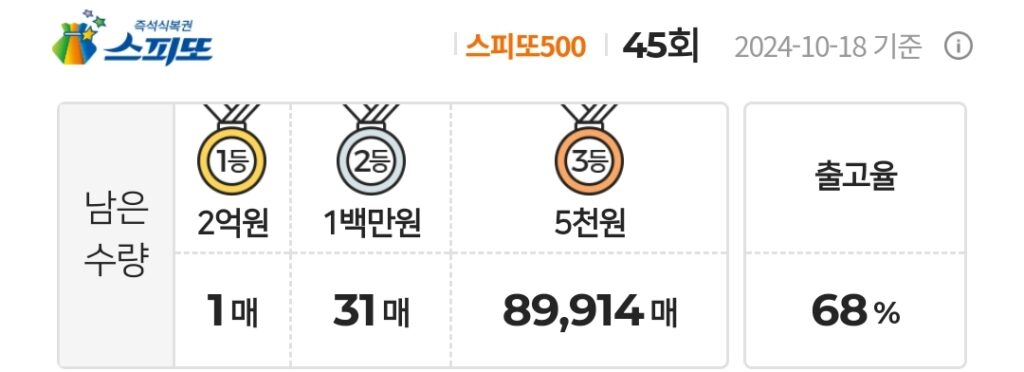 스피또500 45회 1등 남은 수량 및 출고율 정보 및 당첨현황 정보입니다.