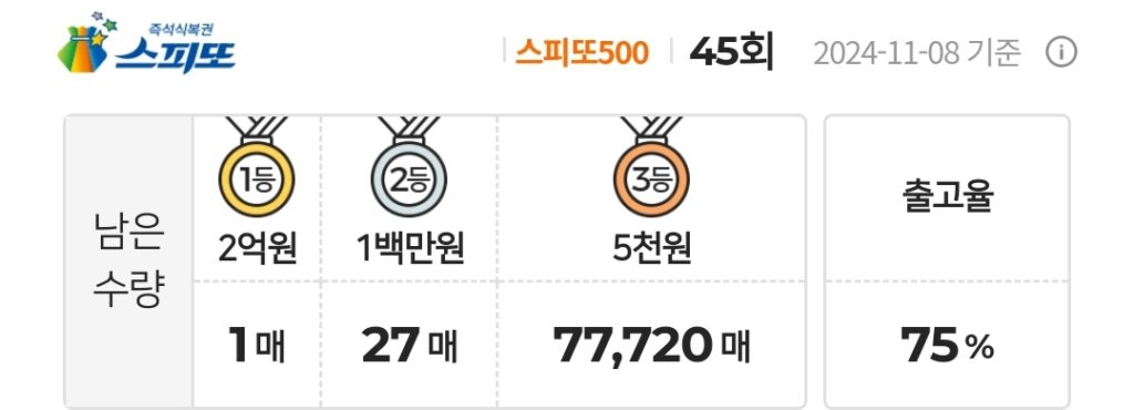 스피또500 복권 45회 남은수량 1등 1매(총 3매 중), 2등 27매(총 60매 중), 3등 77,720매(총 180,000매 중)가 남아 있습니다. 출고율(판매점 입고율)은 75%입니다. 출고율의 의미와 당첨확률을 높이는 방법은 스피또 당첨확율을 높이는 방법은? 구입전에 출고율과 남은 수량을 확인은 필수! 포스팅을 참고하세요.