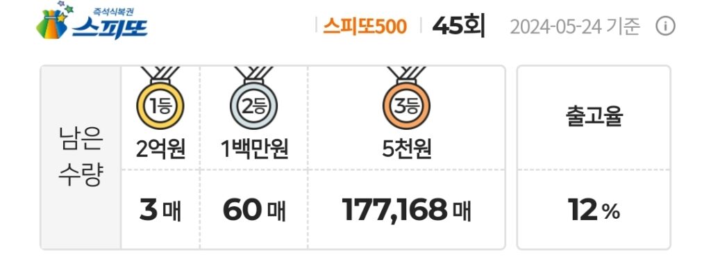스피또500 45회 1등 남은 수량 및 출고율 정보 및 당첨현황 정보입니다.