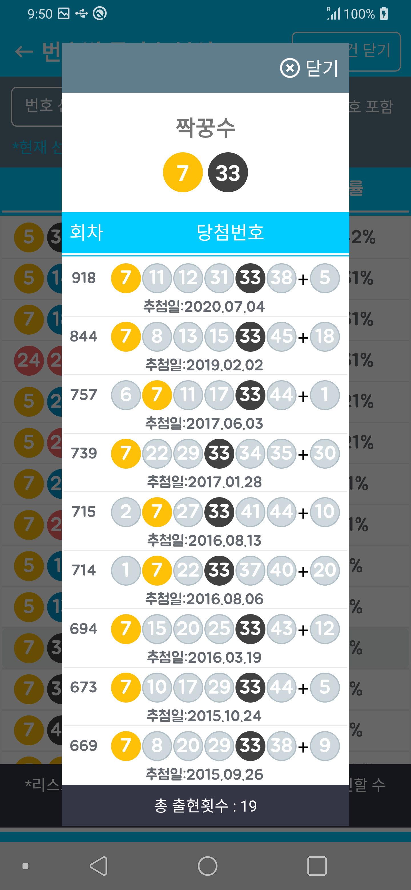 짝꿍수 리스트를 클릭하시면 짱꿍수가 출현했던 회차 정보를 확인할 수 있습니다.