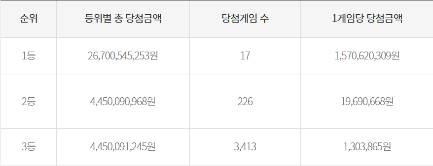 순위 당첨금액 실수령액 1등 1,570,620,309원 1,085,315,608원 2등 19,690,668원 15,358,722원 3등 1,303,865원 1,303,865원