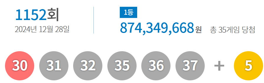로또 1152회 당첨 번호 및 당첨금액 및 당첨 게임 안내