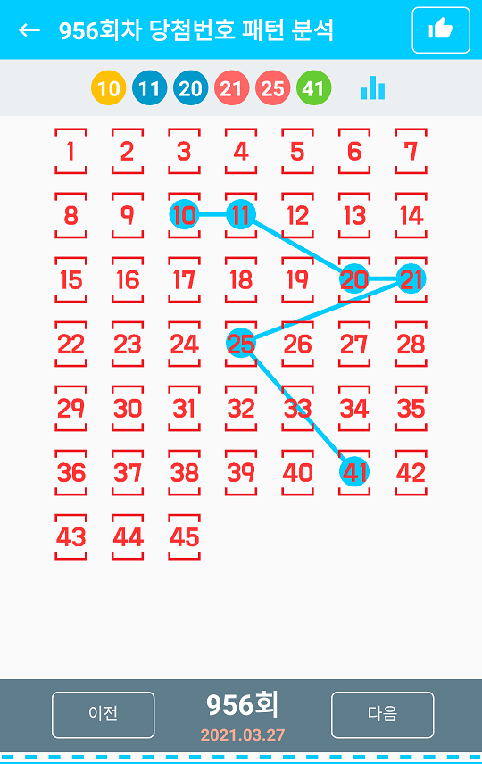 1. "이전" 버튼과 "다음" 버튼을 클릭하여 회차를 이동해가며 당첨번호 패턴을 확인하세요.