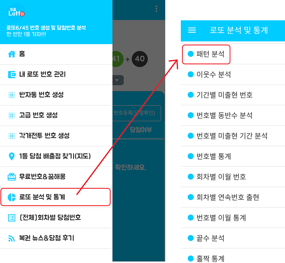 당첨번호 패턴 분석 기능 메뉴에 대한 사용방법을 안내해드립니다.