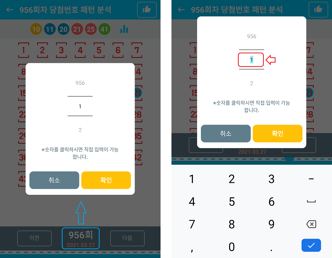 2. 회차 정보 부분(956회)을 클릭하시면 번호 스크롤링 기능으로 원하는 당첨 회차로 이동할 수 있습니다. 스크롤이 귀찮다면 번호를 클릭하세요. 직접 입력 후 이동할 수 있습니다.