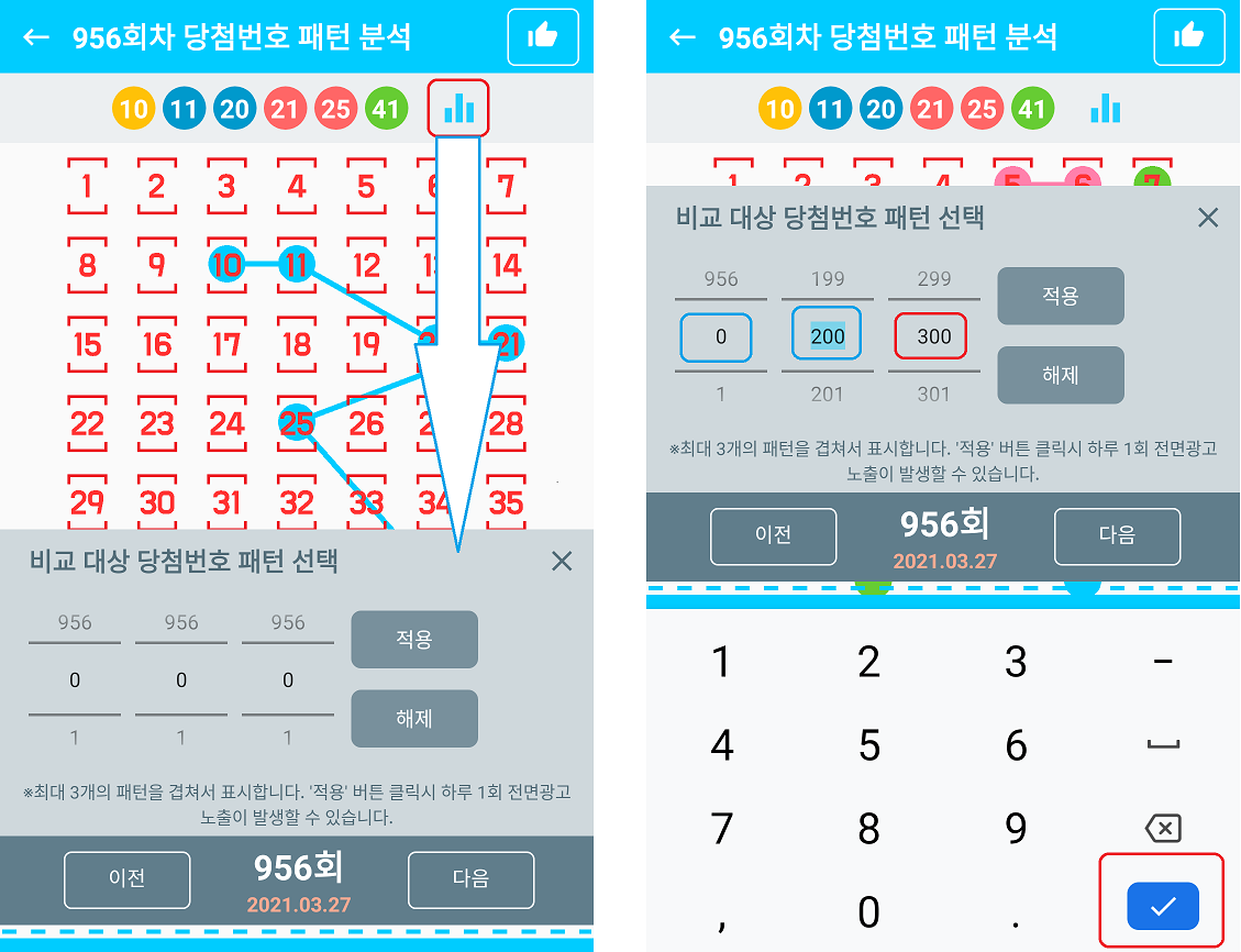 4. 총 3개의 당첨번호 패턴을 겹쳐서 표시할 수 있습니다. 1개만 선택할 수도 있습니다. 번호 선택시 위아래로 스크롤하거나 번호를 직접 눌러 입력 후 적용할 수 있습니다.