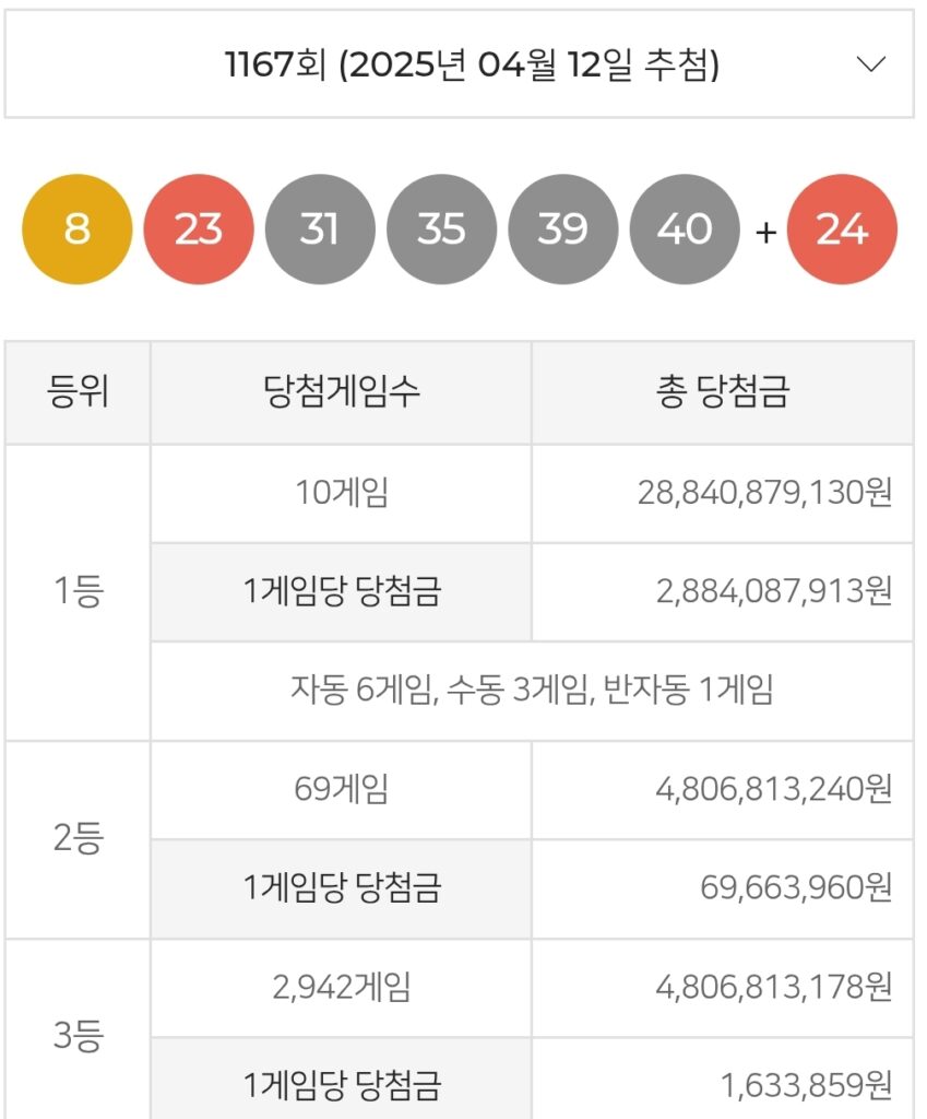 로또 1167회 당첨 번호 및 당첨금액 및 당첨 게임 안내