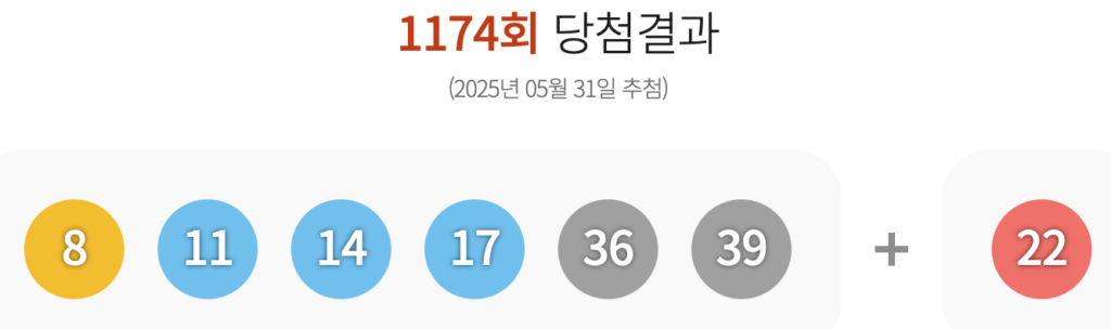 1174회 로또 당첨번호(8,11,14,17,36,39) 및 당첨금
