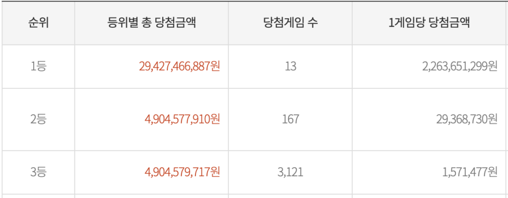 순위 당첨금액 실수령액 1등 2,263,651,299원 1,549,646,371원 2등 29,368,730원 22,907,610원 3등 1,571,477원 1,571,477원