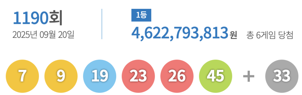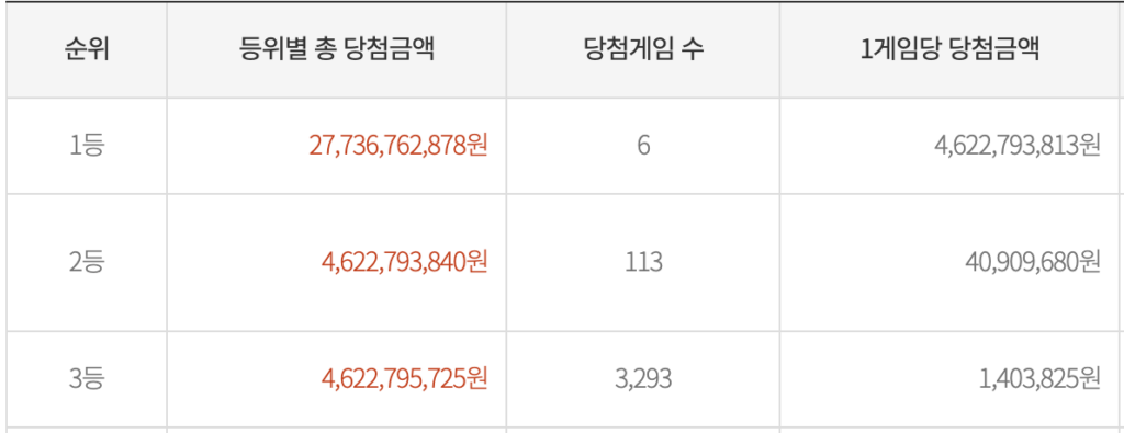 순위 당첨금액 실수령액 1등 4,622,793,813원 3,130,271,855원 2등 40,909,680원 31,909,551원 3등 1,403,825원 1,403,825원