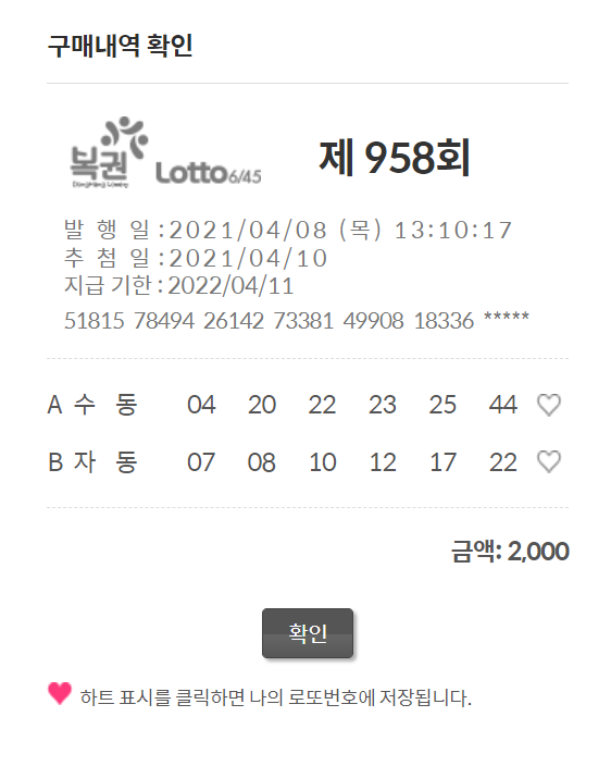 동행복권 온라인 사이트에서 이번주 로또를 구입했습니다.