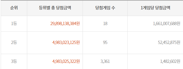 순위 당첨금액 실수령액 1등 1,661,007,688원 1,145,875,151원 2등 52,452,875원 40,913,243원 3등 1,482,602원 1,482,602원