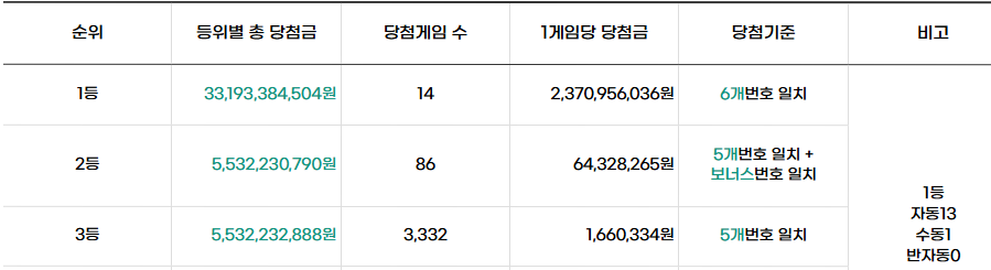 1등 당첨 게임의 수동, 자동, 반자동별 게임수는 아래쪽에 1등 당첨 판매점 목록을 참고하세요.
