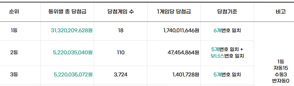 1등 당첨 게임의 수동, 자동, 반자동별 게임수는 아래쪽에 1등 당첨 판매점 목록을 참고하세요.