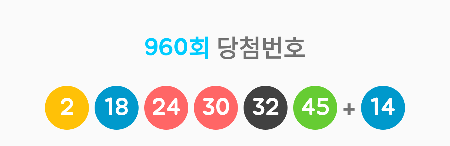 로또 960회 추첨번호는 2,18,24,30,32,45 이며, 보너스 번호는 14입니다.