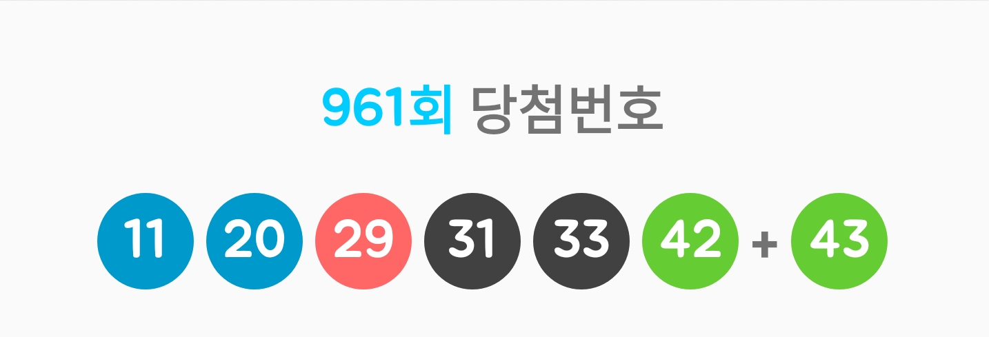 로또 961회 추첨번호는 11,20,29,31,33,42 이며, 보너스 번호는 43입니다.