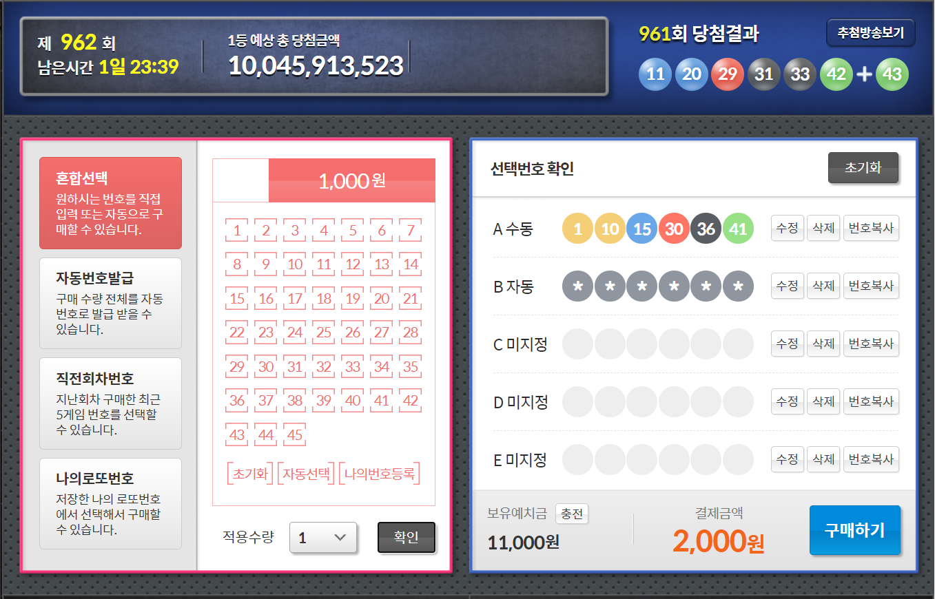 인터넷 복권 구매는 최대 5게임까지만 구매가 가능합니다.