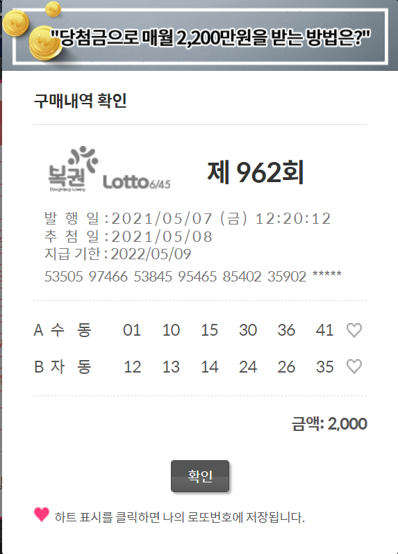 한게임은 수동으로, 한 게임은 자동으로 조합해서 구매를 하였습니다.