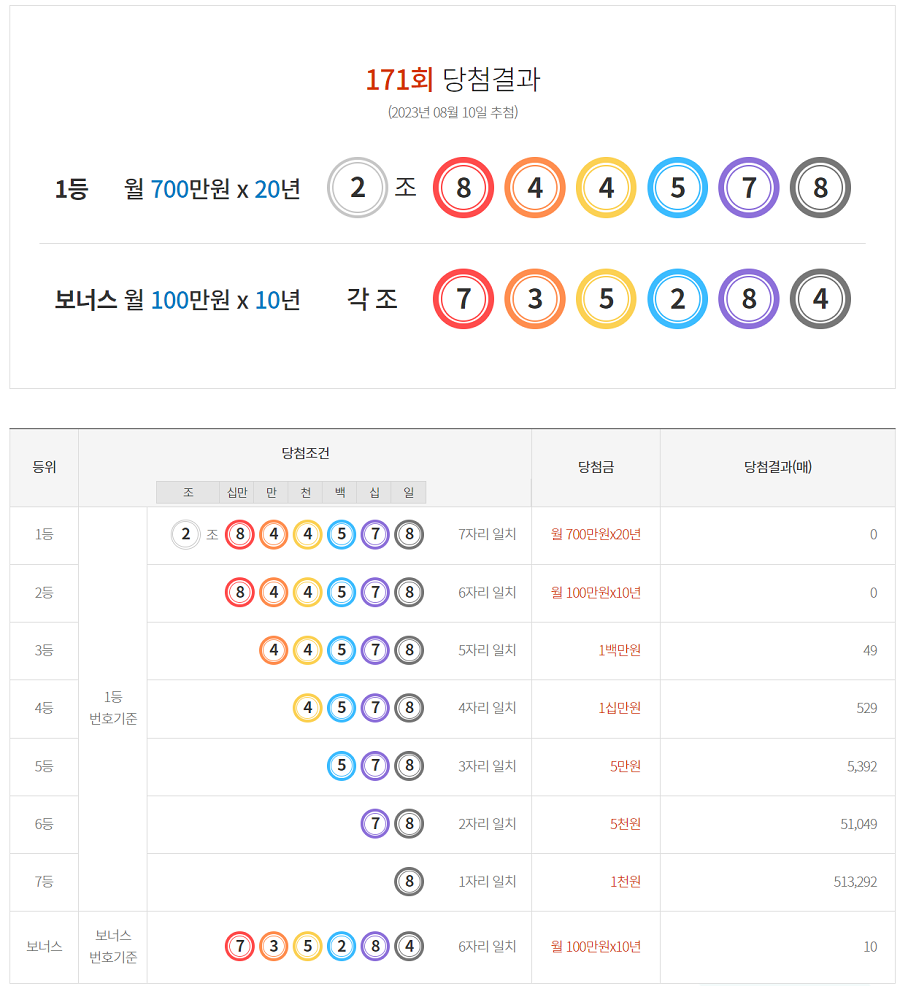 제 171회 연금복권 720 1등 당첨번호는 2조 844578입니다.