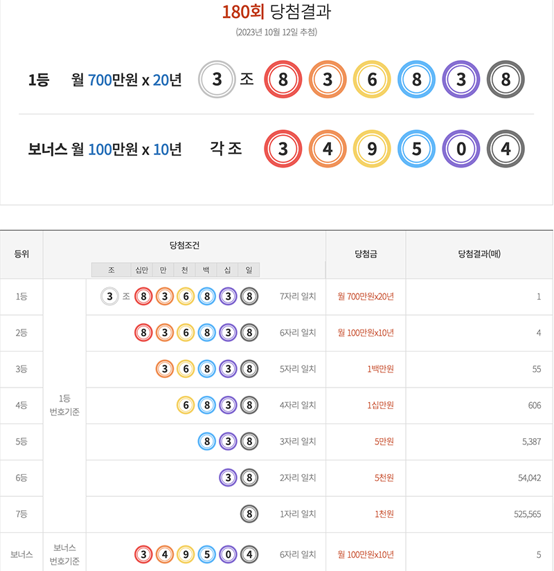 제 180회 연금복권 720 1등 당첨번호는 3조 836838입니다.