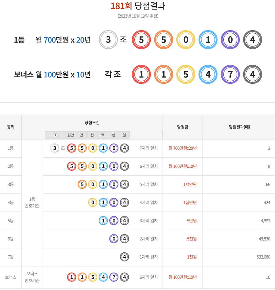제 181회 연금복권 720 1등 당첨번호는 3조 550104입니다.