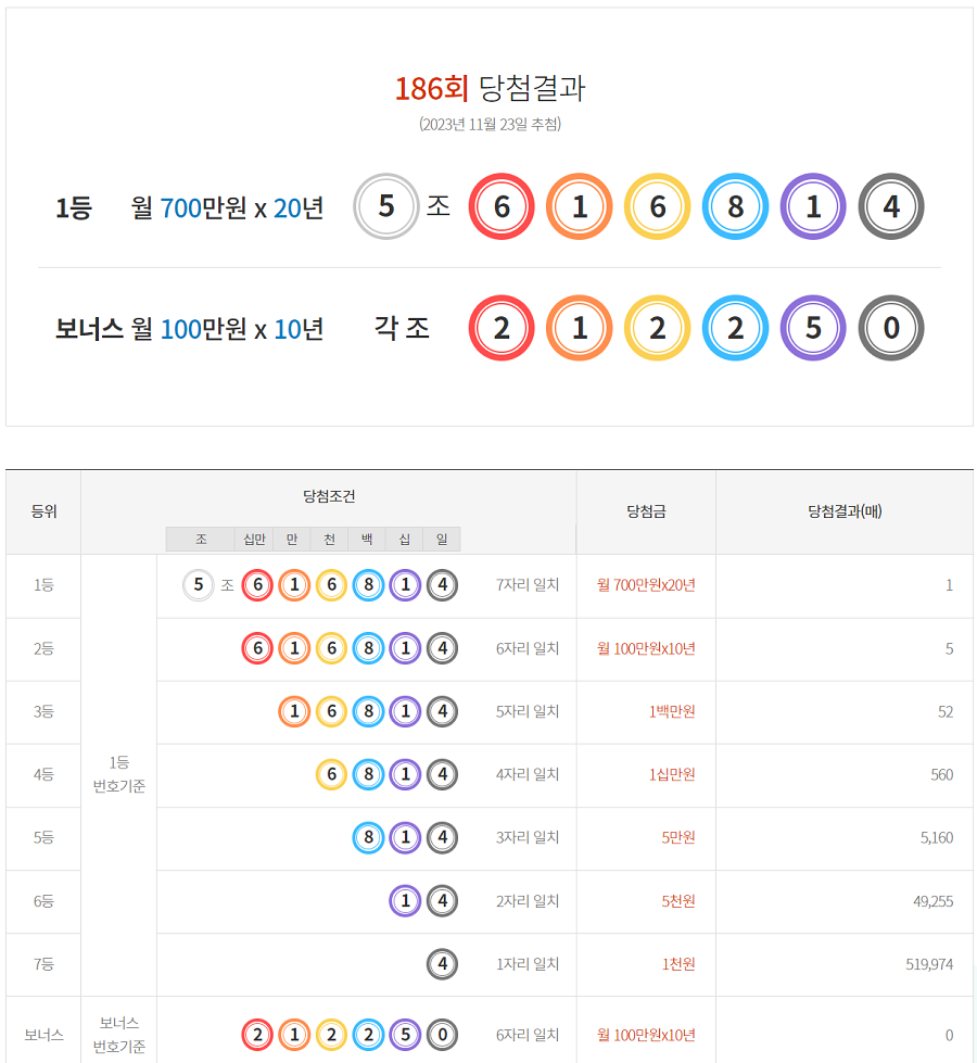 제 186회 연금복권 720 1등 당첨번호는 5조 616814입니다.