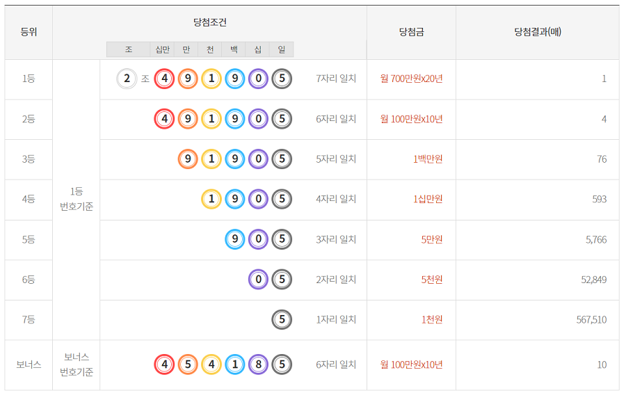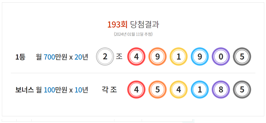 제 193회 연금복권 720 1등 당첨번호는 2조 491905입니다.