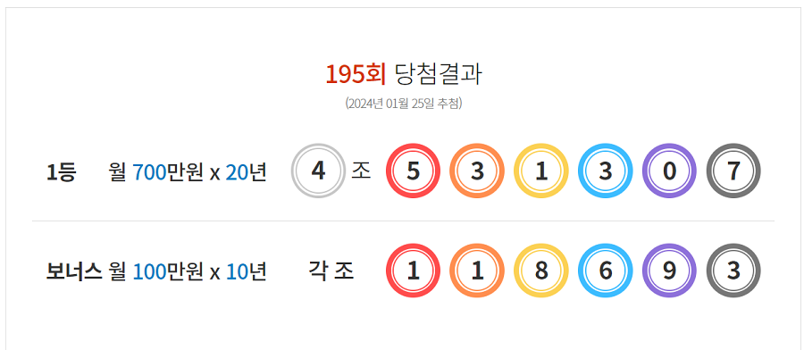 제 195회 연금복권 720 1등 당첨번호는 4조 531307입니다.
