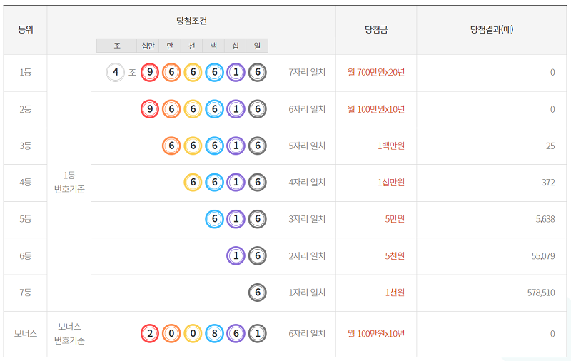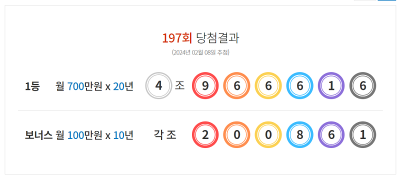 제 197회 연금복권 720 1등 당첨번호는 4조 966616입니다.