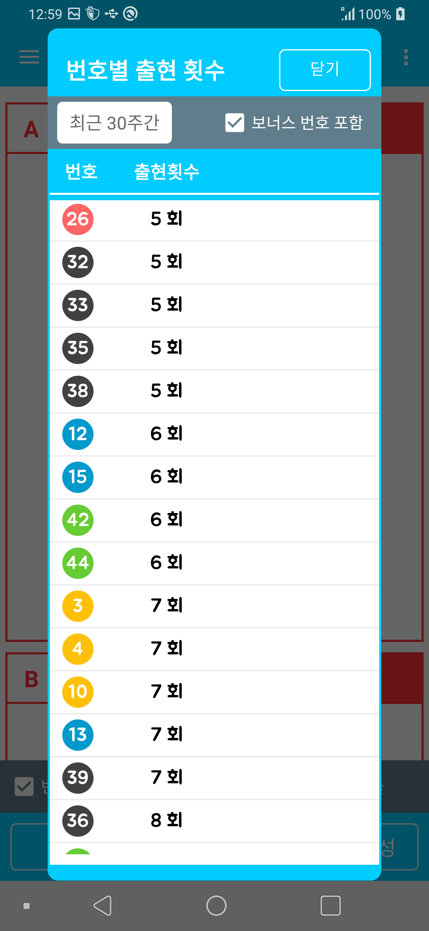 로또 반자동 번호 생성시 번호 선택시 다음 번호 선택을 위해 번호별 출현 횟수 팝업을 제공합니다.