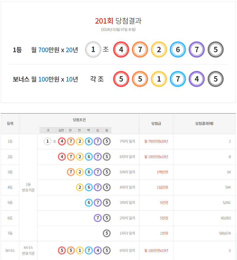 제 201회 연금복권 720 1등 당첨번호는 1조 472675입니다.